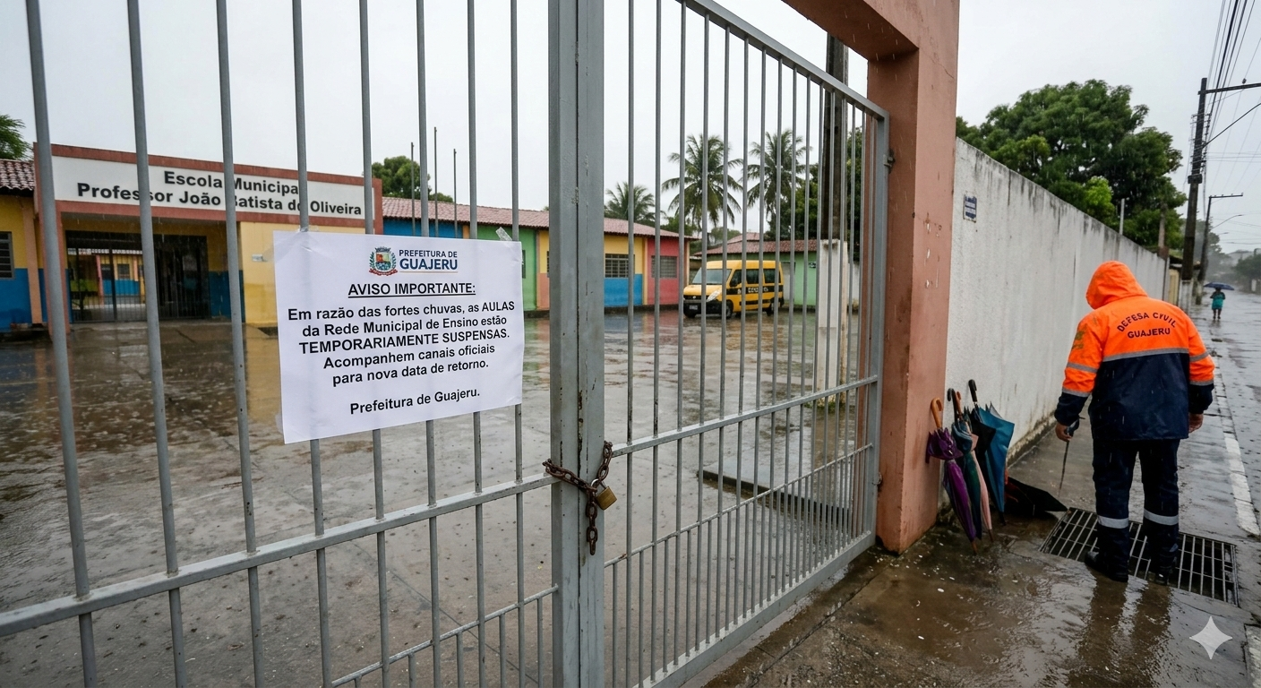 As aulas da rede municipal de ensino de Guajeru, no sudoeste da Bahia, estão temporariamente suspensas a partir desta segunda-feira (2). A medida foi tomada pela prefeitura em consequência das fortes chuvas que atingem o município e toda a região.Em nota oficial divulgada nas redes sociais, a administração municipal informou que a decisão visa garantir a segurança dos alunos, professores e colaboradores, diante dos riscos oferecidos pelos temporais, como alagamentos e dificuldade de locomoção nas vias.A Prefeitura de Guajeru solicitou a compreensão de toda a comunidade escolar e informou que uma nova data para o retorno das atividades escolares será divulgada “em breve”, assim que a situação climática se normalize e a segurança esteja garantida.O município de Guajeru, assim como outras cidades da região, vem registrando acumulados significativos de chuva nos últimos dias, o que tem mobilizado as equipes da Defesa Civil local.